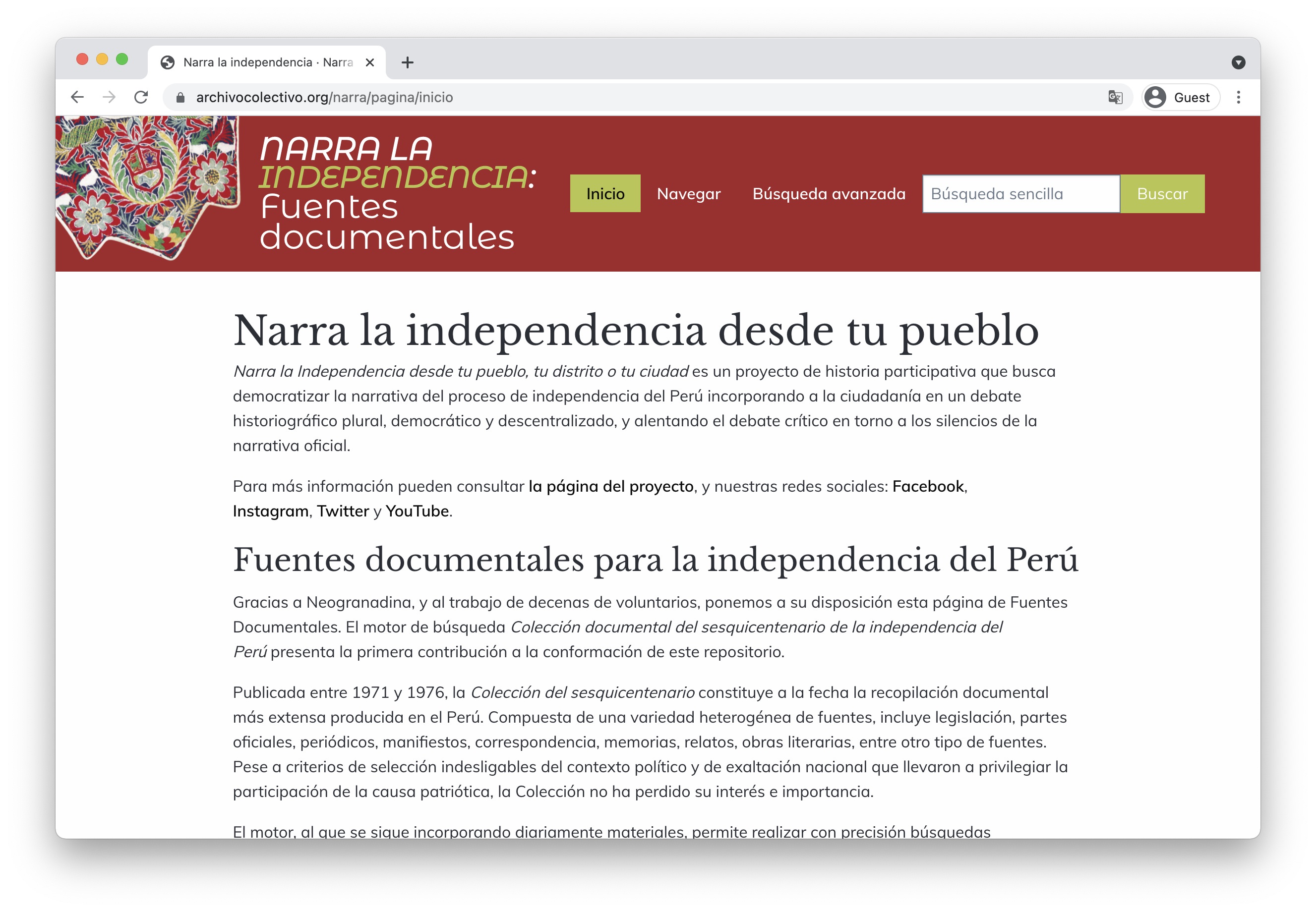 El primer paso —con el apoyo de la Biblioteca Nacional del Perú y de estudiantes de la Universidad Nacional Mayor de San Marcos, en Lima, y la Universidad de California, Santa Bárbara— es la sistematización y publicación de más de 50,000 documentos editados y publicados en los 85 volúmenes de la Colección documental de la Independencia del Perú, que se podrán consultar en el Archivo Colectivo por medio de un sofisticado motor de búsqueda.